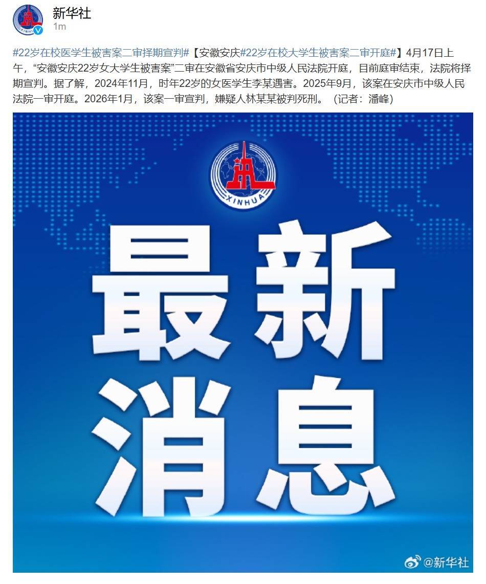 4月17日上午,“安徽安庆22岁女大学生被害案”二审在安徽省安庆市中级人民法院开庭,目前庭审结束,法院将择期宣判。据了解,2024年11月,时年22岁的女医学生李某遇害。2025年9月,该案在安庆市中级人民法院一审开庭。2026年1月,该案一审宣判,嫌疑人林某某被判死刑。
